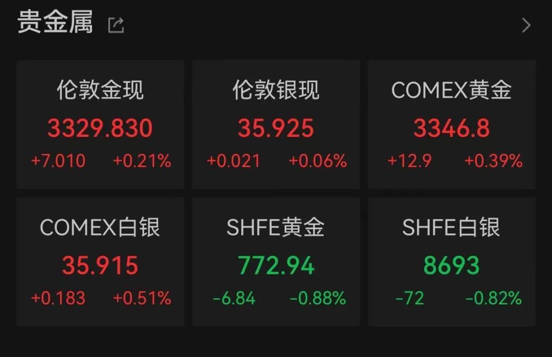 Wind数据显示,24日晚间,国际贵金属期货普遍收跌,现货黄金盘中一度跌超2%,收报3322.93美元/盎司,COMEX黄金期货收盘跌1.66%,报3338.5美元/盎司。25日早间,二者均有小幅上涨,截至发稿,现货黄金涨0.21%,报3329.830美元/盎司,COMEX黄金期货涨0.39%,报3346.8美元/盎司。