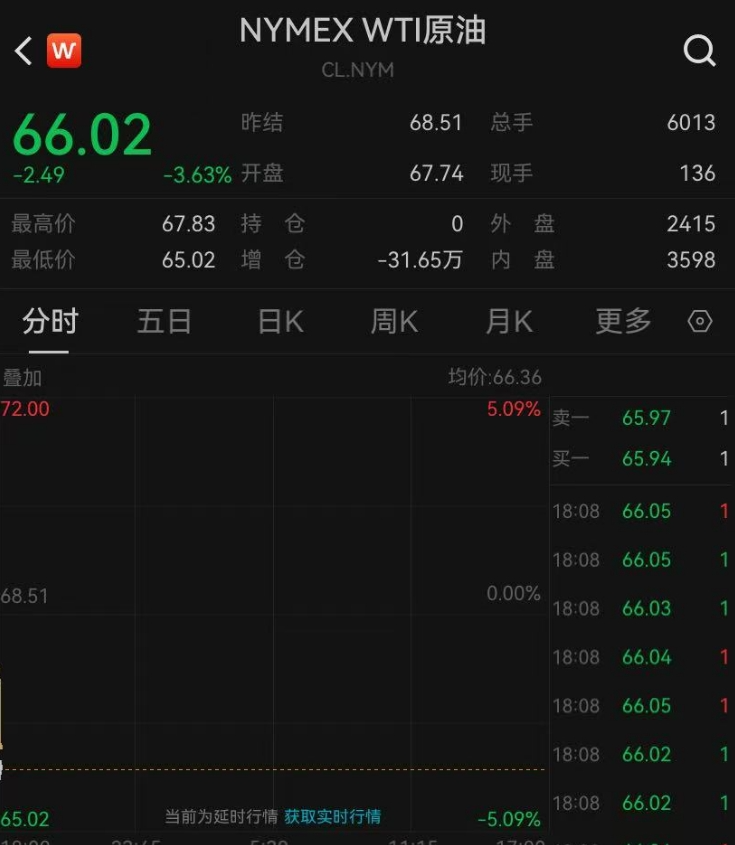 美国东部时间23日傍晚,美国总统特朗普在社交媒体上宣布,以色列和伊朗已就“全面彻底停火”达成一致,这场为期12天的冲突即将结束。受此影响,国际油价大幅走低,美国WTI原油期货亚市盘初一度跌逾5%,截至24日,跌幅收窄至3.63%,报66.02美元/桶。