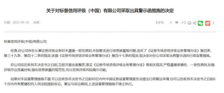 中新经纬9月30日电北京证监局网站30日发布《关于对标普信用评级(中国)有限公司采取出具警示函措施的决定》(下称《警示函》)。